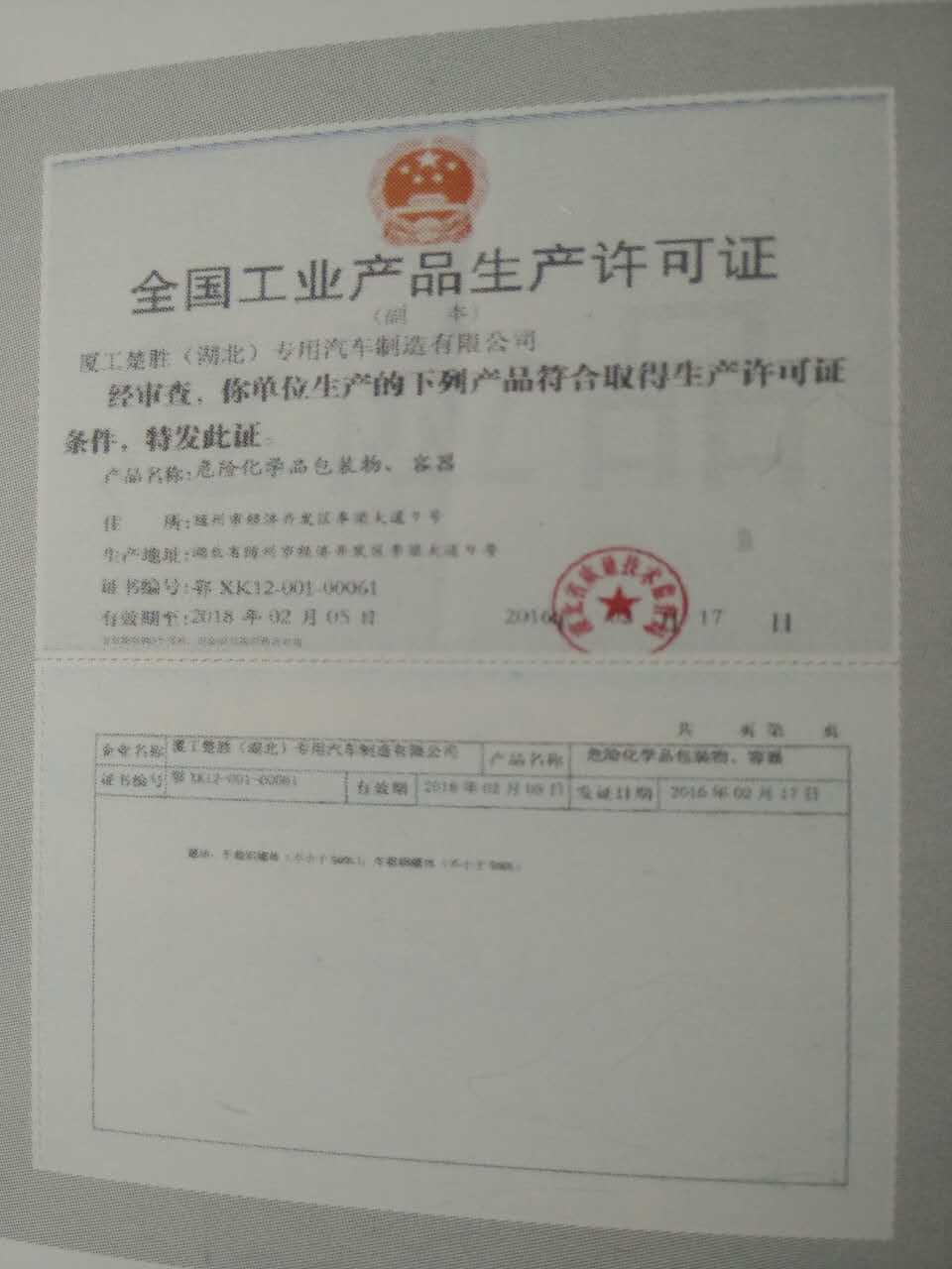 油罐車生產(chǎn)企業(yè)需要那些資質(zhì) 油罐車是危險品運輸里面最常用的車輛,大到國家項目,小到鄉(xiāng)村,你都能看到它的身影,它與我們的生活息息相關。 今天我們就以全國最大的油罐車生產(chǎn)企業(yè)之一廈工楚勝(湖北)專用汽車制造有限公司為例來說明一下油罐車生產(chǎn)企業(yè)的資質(zhì): 廈工楚勝作為全國性的大公司,它所獲得的榮譽是比較多的, 《全國創(chuàng)新型企業(yè)》 《中國馳名商標》 《量管理體系》 《環(huán)境管理體系》等這些是公司基本要求。但作為油罐車生產(chǎn)企業(yè)就必須具有 《全國工業(yè)產(chǎn)品生產(chǎn)許可證(危險化學品)》