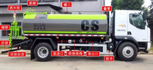 罐體采用4mm厚碳鋼板制作,容積約14立方米,配杭州威龍水泵(可泵進(jìn)泵出),帶前沖、后灑、側(cè)噴,罐體右側(cè)靠尾部帶兩個高位花灑,后工作平臺為沖孔平臺,防滑式踏板,帶綠化灑水高炮,水位計(jì),球閥式消防栓接口和DN65泵進(jìn)出口裝在副駕駛一側(cè),正駕駛尾部一個球閥式消防栓上水口(管道伸入罐體內(nèi)2/3高度位置),正駕駛尾部一根直徑65與后保險杠等長的噴水管(直徑65的管鉆兩排孔朝下噴水),整車全通徑球閥,主管道直徑80,其余出口為65,一個工具箱,后尾部管道左右各一個1寸的洗手閥,罐尾左右各一個圓警燈,兩根與罐體等長的輸水管,其余為工廠標(biāo)準(zhǔn)配置。
